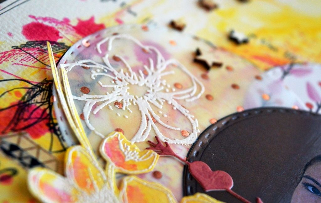 J'ai découpé ma photo avec un die "rond", que j'ai aussi utilisé dans mon "papier imprimé" et dans du "calque à pois". Avant de coller mon calque sur ma page, j'y ai "embossé à chaud" une fleur, et j'ai également embossé des "fleurs" dans ma chute de papier marbré à la mousse à raser.