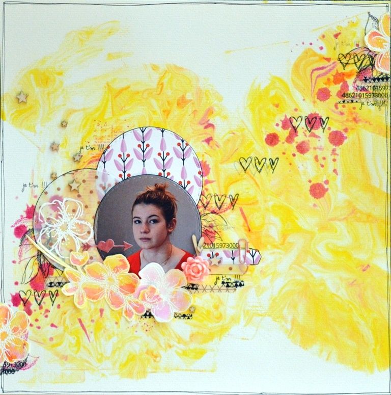 J'avoue que mon fond de page est un peu chargé, mais ce jaune éclatant m'a fait un bien fou car au moment où j'ai fait cette page, on attendait encore le retour du soleil :)