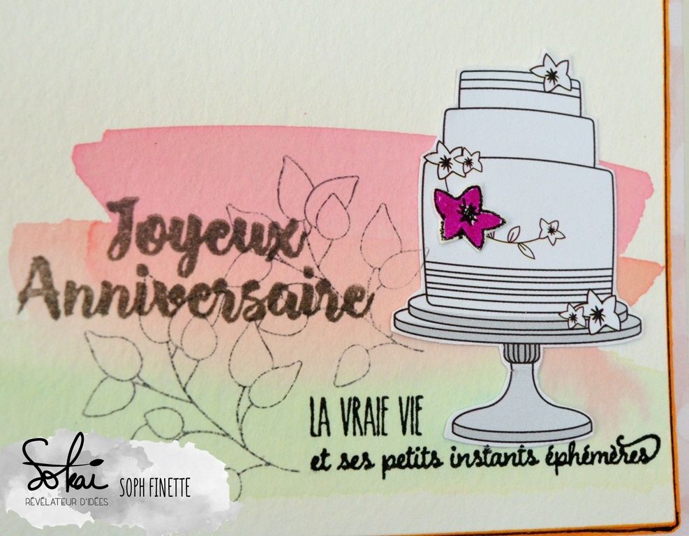 Un de mes tampons préférés (Ronde des tâches) vient souligner la suspension fleurie, et quelques traits de distress diluée viennent mettre en valeur la pièce montée :